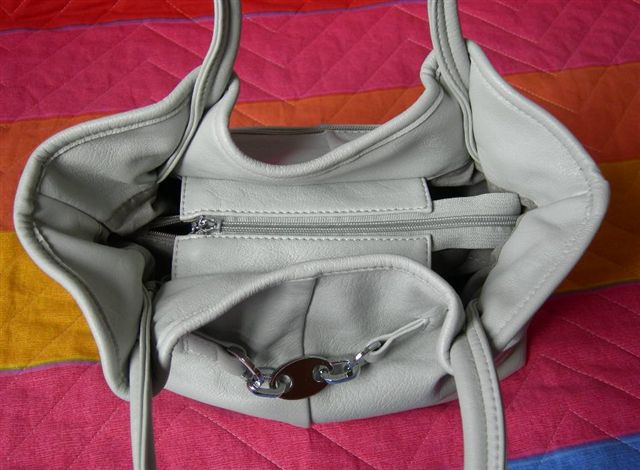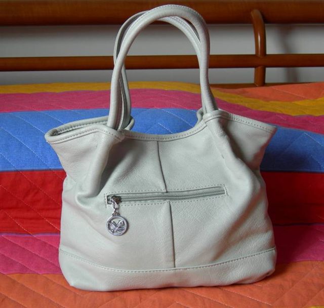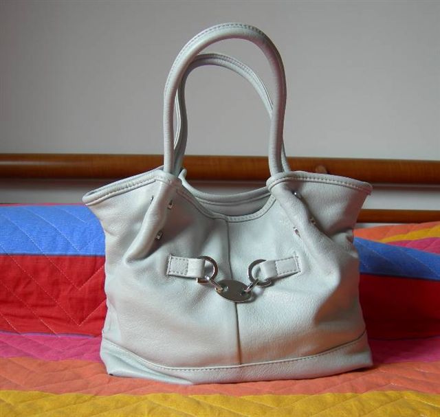 È senza marca, in ecopelle, color bianco ghiaccio/grigio chiaro, piccolina, ma funzionale! Le mie borse normalmente sono di dimensioni medio-grandi-enormi e sono sempre perennemente piene e pensantissime! La borsetta piccina mi mancava da tempo, così adesso imparo a selezionare solo le cose importanti da metterci dentro. Il problema è che già solo la custodia degli occhiali da sole la riempie tutta, perciò occhiali in testa e via!