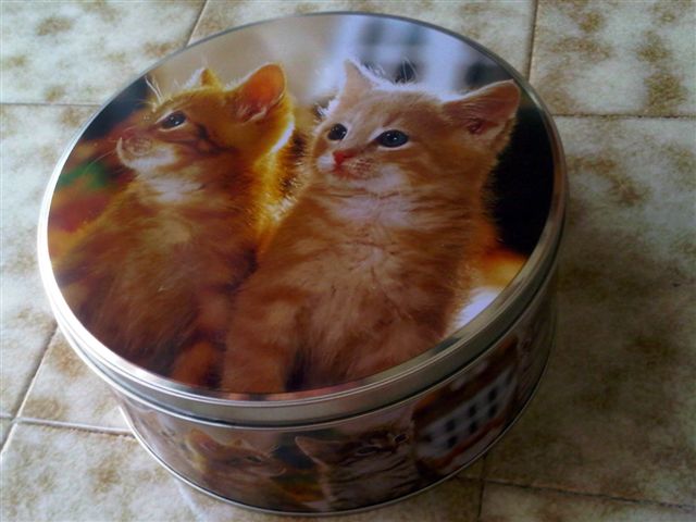 Sono realizzata per il mio acquisto! Non è niente di speciale, solo una scatola di lamiera, con sopra due deliziosi gattini. Io adoro i gatti e mi sono innamorata immediatamente di questa scatola, perché i due micini sul coperchio sono la copia spiaccicata del mio Ginger e di suo fratello Jimmy quando erano cuccioli.