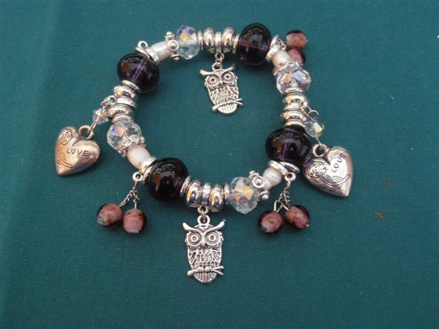 Acquisto n.5: braccialetto viola con gufo e quattro cuoricini.
