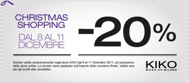 Dal 8 al 11 dicembre Kiko offre uno sconto del 20% su tutta la spesa agli iscritti alla newsletter. Basta presentare questo coupon alla cassa: