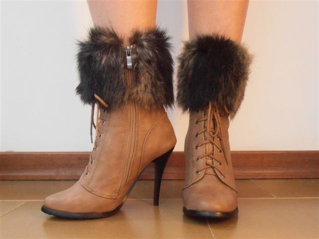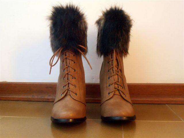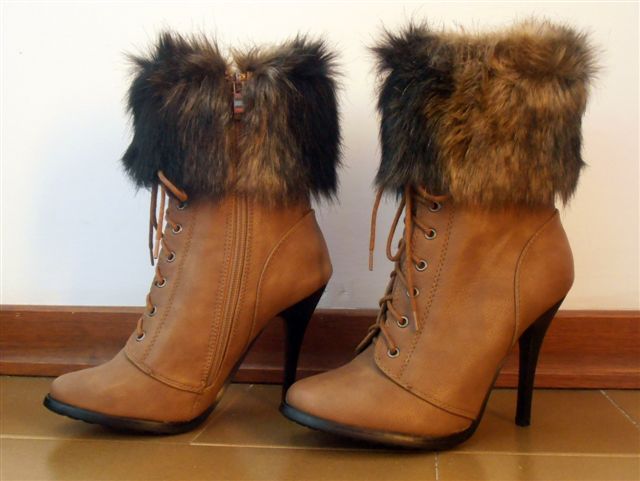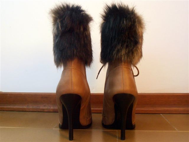Ho trovato in super saldo questo paio di stivaletti, color cachi, con il bordo di pelliccia e mi sono piaciuti! Il tacco è 10.5cm, che scende a 10 se considerate il mezzo centimetro di spessore della suola in gomma. Mi sono piaciuti perché sono particolari e mi danno l’idea di inverno, di caldo, di peluche!