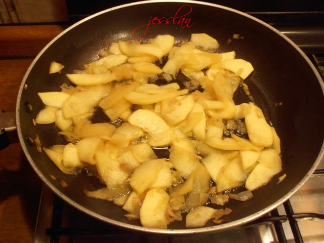 Tagliate la cipolla in modo grossolano e fatela soffriggere con un po’ d’olio. Nel frattempo sbucciate le mele e tagliatele a fettini sottili sottini, quanto più potete.