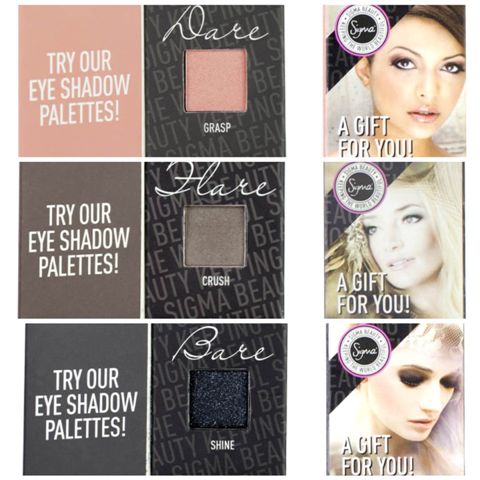 Nuovo regalo da Sigma Beauty, a fronte di $30 di spesa riceverete un ombretto minisize al posto del pennello per sfumature. Vi verrà inviato un ombretto a caso tra questi tre: Shine dalla Bare palette, Grasp dalla Dare palette and Crush dalla Flare palette e i colori potete vederli qui sotto: