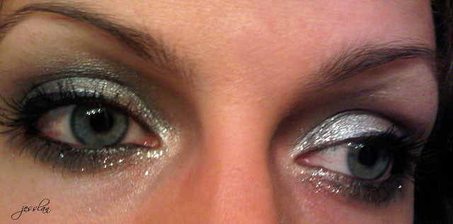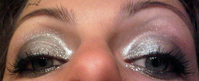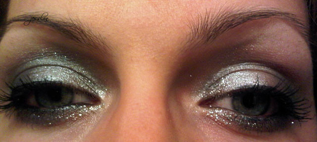 Sulla palpebra mobile ho usato l’ombretto in crema come base e sopra vi ho applicato l’ombretto in polvere argentato del duo Dark Temptation di H&M. Nella parte interna dell’occhio e nella palpebra fissa ho applicato l’ombretto sparkling della Essence. Nella foto non si vedono tanto, ma c’erano vagonate di brillantini! Ho applicato l’eyeliner sulla palpebra mobile e la matita nera kajal nella rima interna. Ho aggiunto il Mascara Curve Creator di Deborah e sistemato le sopracciglia con la matita di H&M.