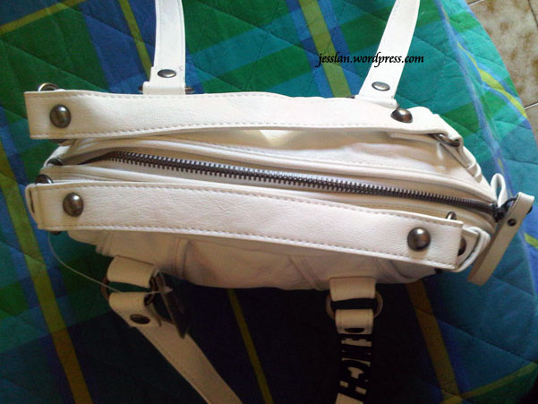 La borsa ha un’altezza di 25cm, larghezza 26, profondità 14cm e un volume di 9,1litri. Insomma, non è né piccola, né grande, ma la giusta via di mezzo. È composta da materiale sintetico esternamente, in simil-pelle bianca, mentre l’interno è di tessuto, sempre bianco.