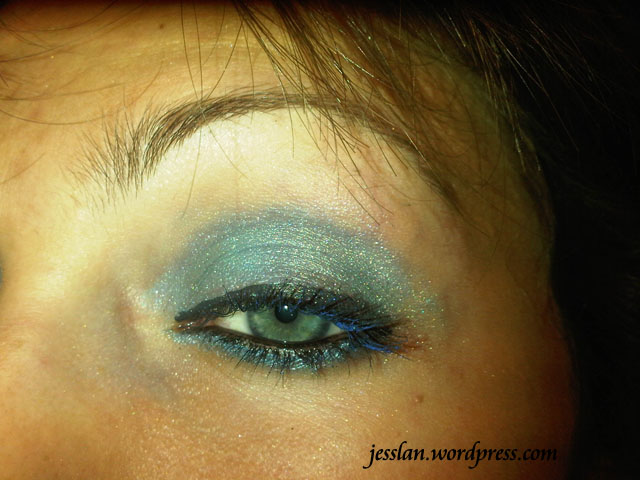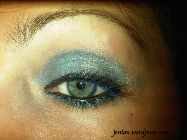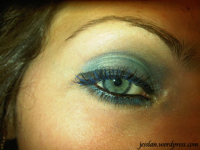 Ho usato la polvere blu della ELF nella parte esterna dell’occhio e nella parte interna ho usato l’ombretto azzurro chiaro della Project. Sotto l’occhio ho applicato la matita azzurra di Kiko, nella rima interna ho applicato la matita kajal nera di Kiko e sulla palpebra mobile l’eyeliner Precision di Kiko. Il mascara è sempre l’infinito mascara Curve Creator di Deborah, sopra al quale ho applicato anche il mascara azzurro di Extreme (quasi secco, ma l’ho rianimato).