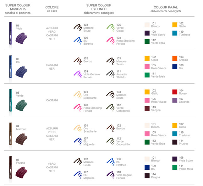 Partendo dalle 10 sfumature di Super Colour Mascara, fino alle diverse tonalità di Kajal e Eyeliner, Kiko propone un po’ di abbinamenti: