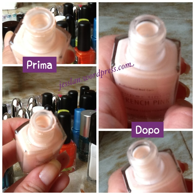 Una soluzione molto semplice al problema è quella di pulire i residui di smalto dal collo e per farlo basterà il classico batuffolo di cotone intriso di solvente, che utilizzate per togliere la manicure. Personalmente faccio questa operazione una volta ogni tanto, perché avendo parecchi smalti passa un po’ di tempo tra due utilizzi dello stesso colore; inoltre, è un’operazione abbastanza lunga (quando lo faccio pulisco TUTTI i vasetti) e da fare rigorosamente senza niente sulle unghie, altrimenti avrete cotone appiccicato su ogni dito!