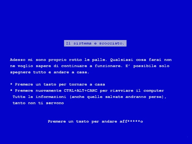 La cosa che più mi ha angosciata, dico davvero angosciata, è che la schermata blu che lo stronzo Windows fa quando è pronto a morire, o semplicemente a svenire come in questo caso, è esattamente lo stesso blu del mio smalto! Stessa punta, solo che lo smalto ha in più dei microglitterini, ma il colore di fondo è uguale! Mi viene quasi voglia di mettermi a fare le scrittine bianche anche sulle unghie!
