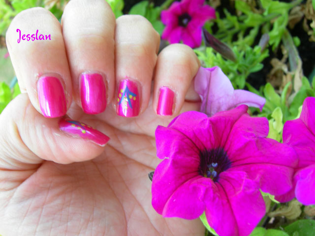 L’avrete riconosciuto, è il Rosa Peonia #251 di Kiko e i disegnini sono stati fatti utilizzando il Tip painter #07 ocean breeze di Essence, per fare i rametti, e il giallo Lime up! sempre di Essence, per fare i fiorellini stilizzati. Ho applicato il top coat della Tero, solo sugli anulari e sui pollici.