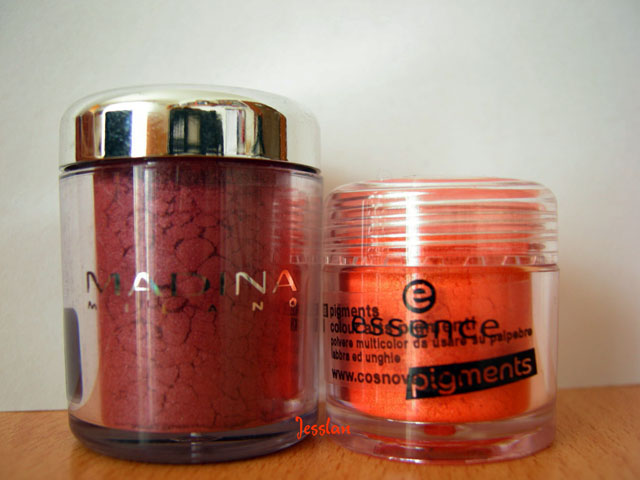 L’altro acquisto da Madina è stato il pigmento #09 Istant Pearl, un prugna chiaro, che nella foto vedete insieme al pigmento arancione di Essence, il #07 Safety First, comprato venerdì in una Ovs. Prezzo Madina 2.40€. Prezzo Essence 2.99€.