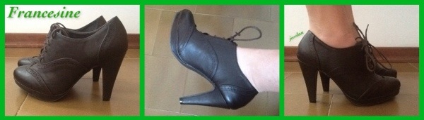 Il quarto acquisto sono state le tanto agogniate francesine! Le ho cercate e ricercate per tempo immemore e alla fine eccole qui! Sono in eco-pelle marrone, il tacco è 11cm e hanno 1cm di plateau! Sono comodissime, riesco a camminarci per molto tempo e anche a guidare. Insieme ai bikers, questo è l’acquisto che mi ha soddisfatta di più! Ora ho preso la fettuccia in raso marrone e sostituirò le stringhe originali con quelle in raso.