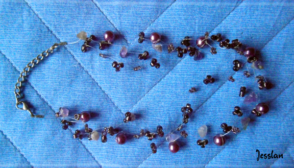 Questa collana non è un regalo di un’amica, leggerissima, fatta col filo trasparente, pietrine viola e perle.