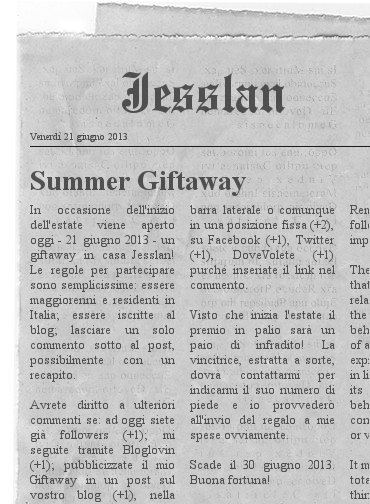 Buongiorno care! Il venerdì siamo solite parlare di scarpe, ma oggi è un venerdì particolare perché è il primo giorno d’estate! E proprio in occasione dell’inizio dell’estate viene aperto oggi – 21 giugno 2013 – un giftaway in casa Jesslan!