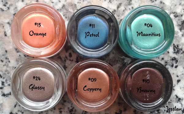 Vi avevo già recensito i primi quattro colori, dei quali vi mostro comunque una foto più nel dettaglio per rinfrescarvi la memoria. Gli ombretti sono contenuti in vasettini di vetro da 4.5g e sono in mousse.