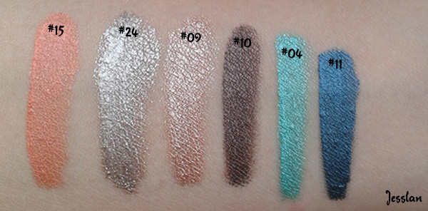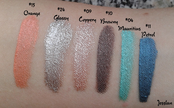Vi ricordo che l’applicazione di questi ombretti deve essere rapida, perché tendono ad asciugarsi molto molto velocemente e diventa impossibile sfumarli dopo. Io li applico con le dita oppure con il pennellino piccolo di H&M o, ultimamente, con un pennello a lingua di gatto del set da 20pz di Fraulein (il più stretto di quelli che vedete). Ed ora un po’ di swatch per farveli vedere tutti insieme!