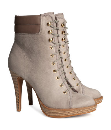Saranno presenti anche alcuni stivaletti a mezza altezza o tronchetti, come questi stringati, con un tacco di 12cm e plateau di 2cm. Il prezzo è 499sek, circa 50€.