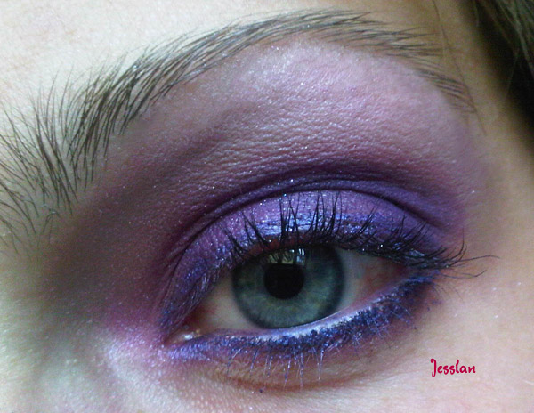 Ho usato: ombretto mono viola matt di Kiko, ombretto cotto lilla di Astra, matita metallic viola di Essence (sia sulla palpebra mobile che nella rima interna). Il mascara credo che fosse il top coat curling di Kiko.