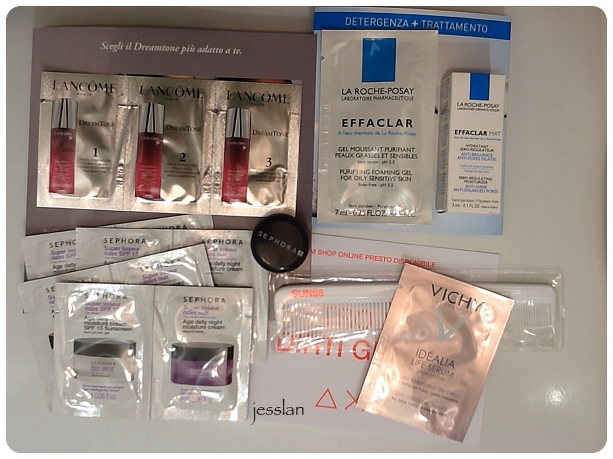 Ed ora omaggi senza obbligo d’acquisto da varie fonti, grazie a coupon: campioncini delle tre creme Dream Tone di Lancôme e una jaretta di Sephora con la crema n.2 di Lancôme e bustine di creme viso e notte. Dalla farmacia arrivano, invece, i campioncini di Effaclar di Le Roche Posay [coupon] e di Idealia di Vichy [coupon]. Da Sun68 un pettine in plastica.