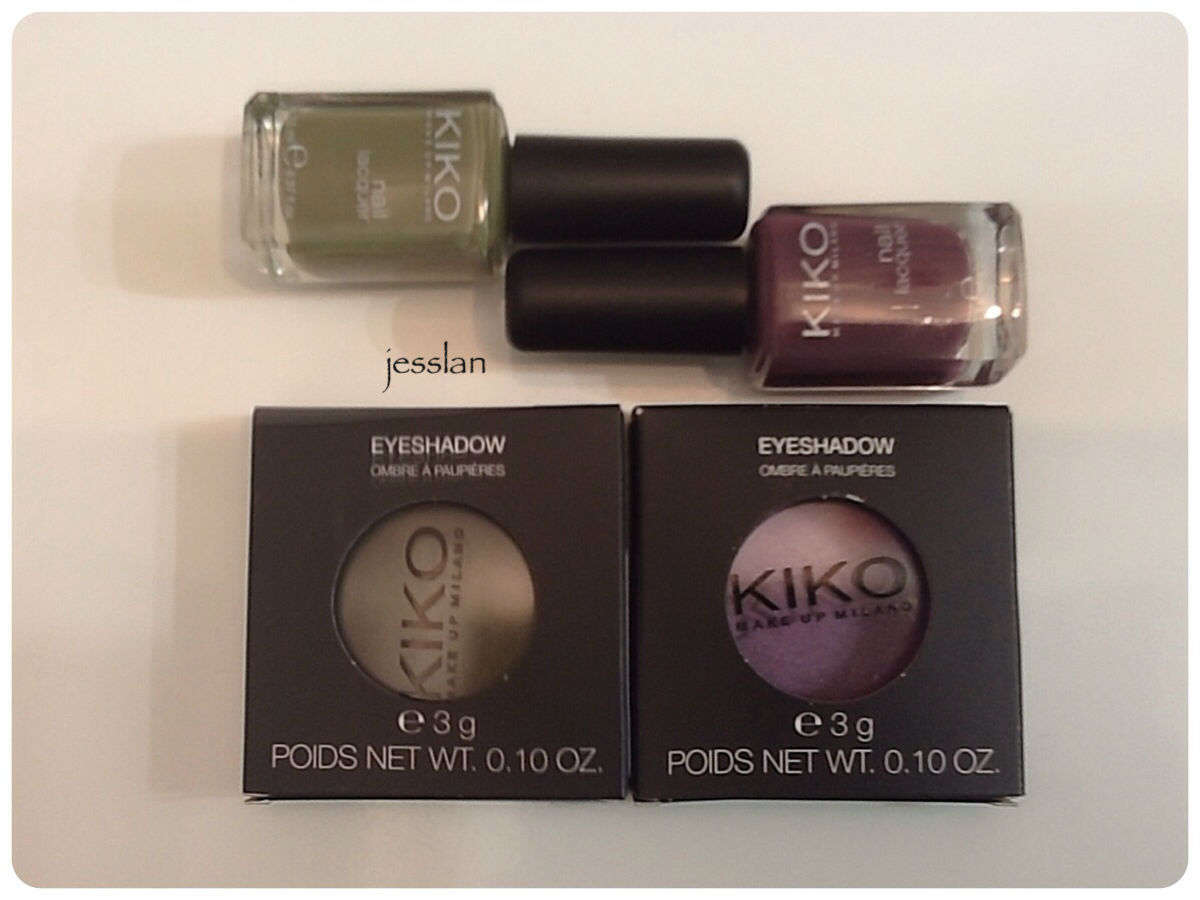 Ho visto anche la mia amica Pollon e tra i vari regali che mi aveva fatto per il compleanno, molti dei quali in tema mimetico, c’erano due smalti Kiko #394 e #379 e due ombretti #116 e #152, entrambi nelle stesse tonalità di verde e viola. Grazie anche a te, Pollon!