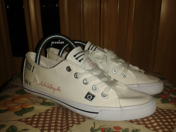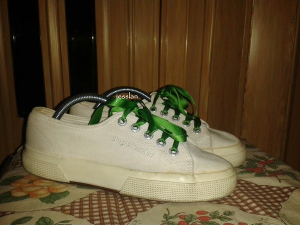 Devo dire che non possiedo molte cose di questo colore. Nella mia enorme scarpiera ho solo pochi esemplari bianchi, ovvero una scarpa da tennis di tela di Tacchini (cui io ho sostituito le stringhe originali, con delle stringhe in raso verdi o lilla), un’altra scarpa da tennis di Lulu Castagnette nuova di trinca e mai usata e dei sandaletti bassi, non pervenuti.
