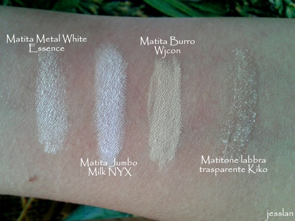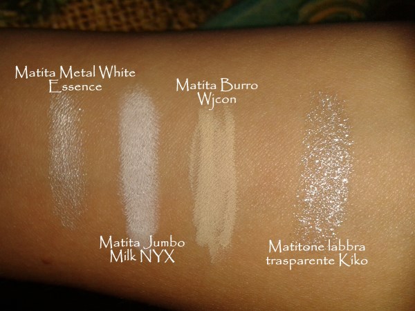 Ho una matita per la french di Bottega verde, un matitone/gloss bianco-trasparente di Kiko, la matita Metal White di Essence (che spero di finire a breve), il matitone jumbo Milk di NYX e la matita color Burro di Wjcon (che sto adorando e ve ne parlerò pima o poi). Vi lascio gli swatch in due condizioni di luce.