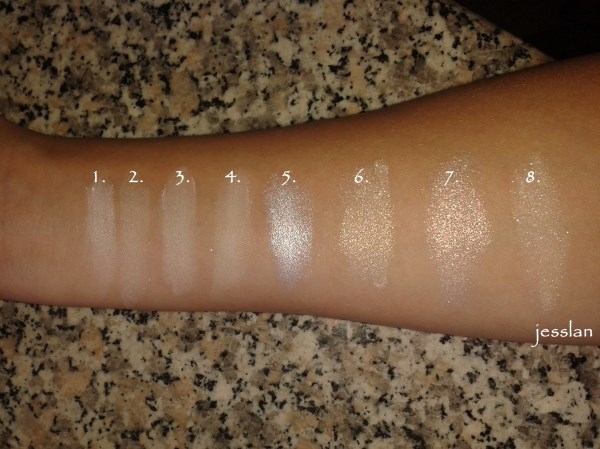 1. bianco della mini palette comprata con Manu e Elly a Barcellona; 2. appartiene a una palettina con quattro ombretti della ELF; 3. appartiene alla palette verde di Bottega Verde; 4. è il bianco contenuto nella Sleek Au Naturel; 5. il meraviglioso bianco super shimmer della Sleek Showstoppers; 6. pigmento Vanilla di M.A.C; 7. pigmento Bianco di Kiko; 8. ombretto minerale di Clarins (in foto non rende).
