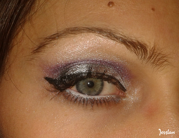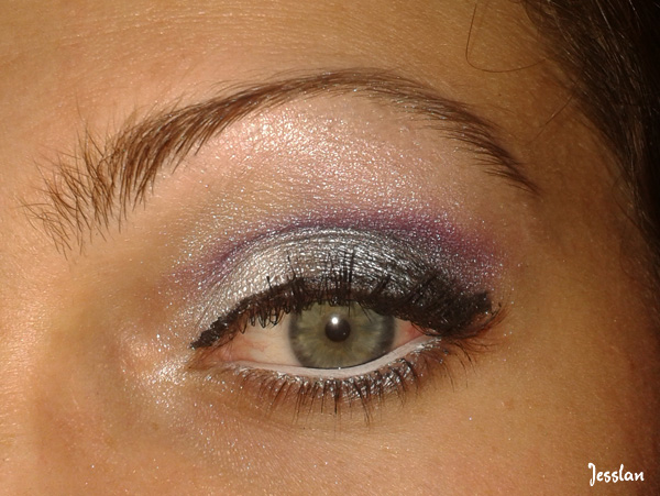 Per realizzarlo ho utilizzato la cialdina Me, myself & eye bianco shimmer della palette Sleek Showstoppers nell’angolo interno dell’occhio. Sempre dalla stessa palette ho preso il viola glitterato Au Naturel, per sfumarlo nella piega. Ho utilizzato inoltre anche l’ombretto grigio argentato del duo Dark Temptation di H&M circa nella metà della palpebra e il grigio scuro della stessa cialda nell’estremo angolo esterno.