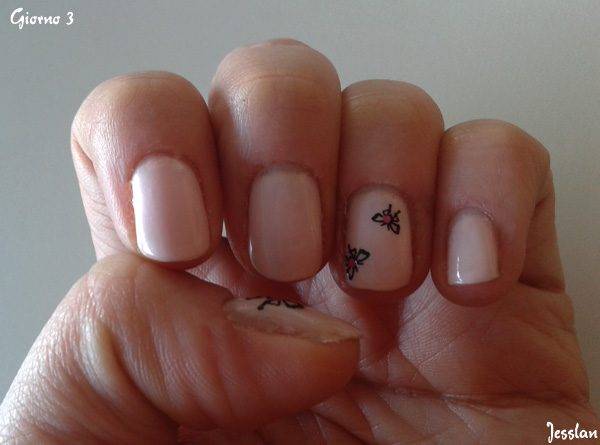 Come potete notare, al settimo giorno lo smalto era ancora perfetto e l’ho tolto per noia! Non tutti gli smalti sono adatti per fare la copertura a gel, ma questo sicuramente è l’ideale. Avevo applicato anche delle piccole farfalle stilizzate su due unghie, giusto per movimentare un po’ questo rosino fin troppo sobrio per me!
