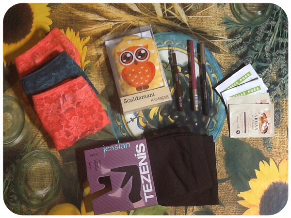 Un primo giro di shopping ha portato qualche slip e dei leggins di Tezenis, uno scaldamani a forma di gufo di Kasanova, la matita occhi marrone di Wjcon, una matita occhi verde scuro e una matita labbra fucsia di Bottega Verde. Per altro, se scaricate la cartolina di Bottega Verde e accumulate 18 bollini, potrete avere in regalo il coordinato lenzuola e asciugamani lilla. Accumulate un punto a settimana se non fate acquisti, mentre avrete due punti con un acquisto superiore a 5€.