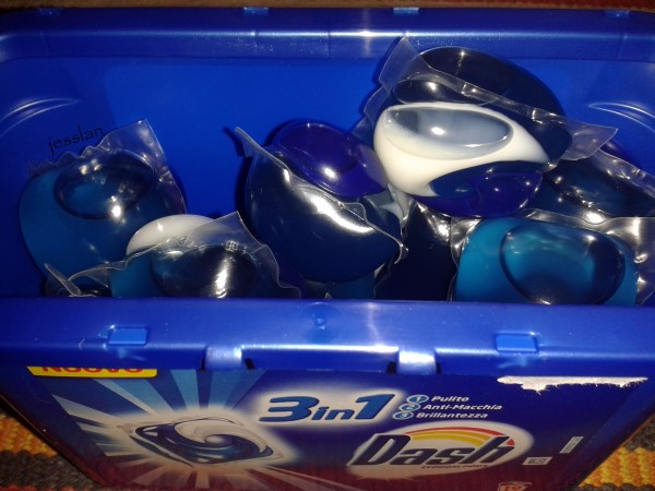 Le 19 ecodosi, contenute in una confezione di plastica blu richiudibile, sono state messe proprio di fianco alla lavatrice, pronte all’uso, mentre alcune delle altre le ho già disseminate tra vicine di casa e parenti!