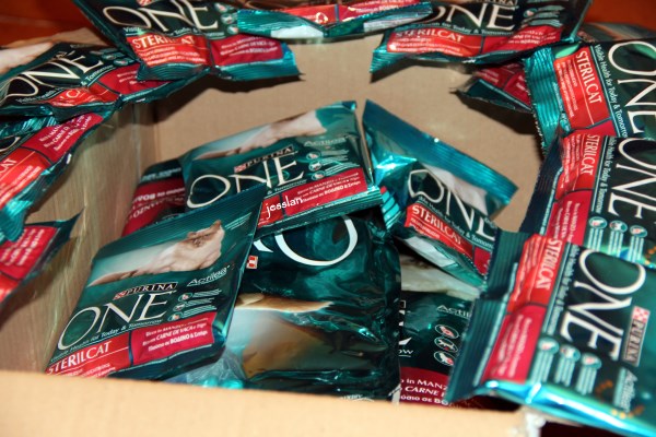 Nel pacco che ho ricevuto erano presenti una ciotola “sbavabaffi” verde acqua, tre confezioni di crocchette da 800g e 14 bustine da 50g.