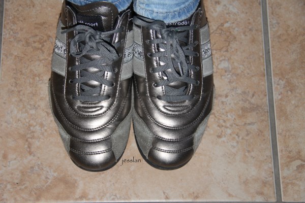 Le uniche scarpe che ho in questo colore sono le sneakers che uso tutti i giorni, marca Estrada, molto comode. Niente tacchi per ora, ma prevedo di acquistarli per un matrimonio a cui devo andare a giugno, per abbinarli al vestito verde; ho visto un paio di sandali dorati di Steve Madden, ideali per un matrimonio!