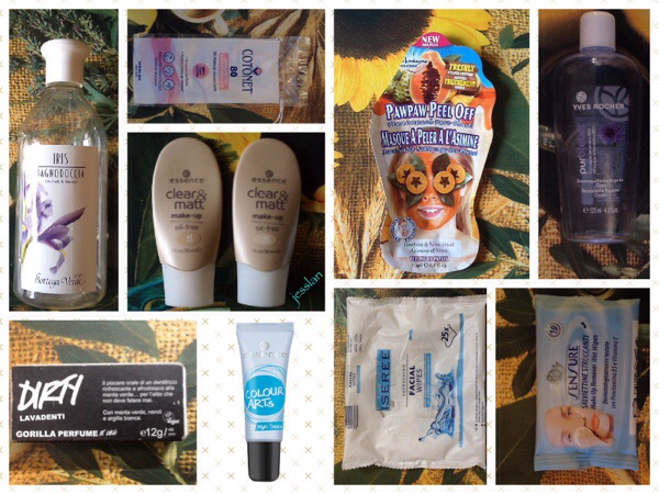 English summary. April is come to the end and today we are talking about the products I finished this month. This was a normal month, I’m happy because I finished two foundationsof Essence; one was too light for me and the other one was a bit dark, but mixed together they were ok! I used also the eye base Color Arts of Essence and I like it, because it does its work really well. “Dirty” of Lush is a very funny product, useful to wash teeth when you travel, for example I used it every day after lunch in the office. I finished also some wipes, a shower gel and a make-up remover. What did you finished this month? Kiss.