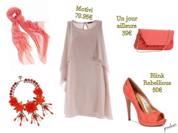 Nel secondo outfit inserisco un vestito beige, molto morbido (Motivi, 79.95€), sempre con una stola, questa volta in color corallo; del medesimo colore sceglierei le décolletés open toe Rebellious di Blink (Spartoo, 50€), la pochette (Un jour ailleurs, 39€) e una maxi collana.