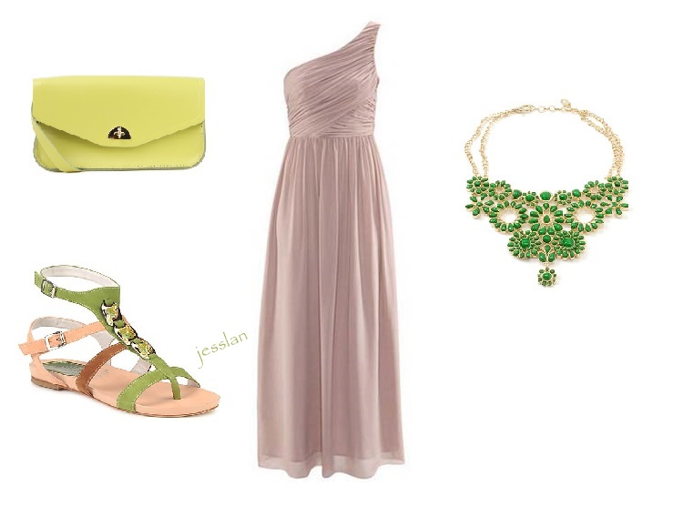 Purtroppo non so di chi sia questo abito, l’ho trovato su google images, mi piace sia per il colore che per il modello. Il corpetto è molto carino, anche se non so se potrebbe starmi bene dato che non ho molto materiale con cui riempirlo. Ho pensato di abbinarlo con un sandalo nero e arancione, del quale il tacco non mi ispira troppo, e una collana fatta all’uncinetto.