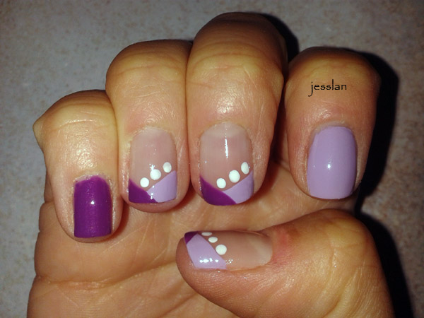 È una nail art semplicissima, fatta con il lilla di Kiko e un viola di Essence. Ho usato la preotecting base di Essence e il top coat effetto gel di Shaka. I pallini sono stati fatti con un dotter di dimensioni medie, usando lo smalto bianco di Astra. Le foto sono entrambe fatte col flash, perché era notte.