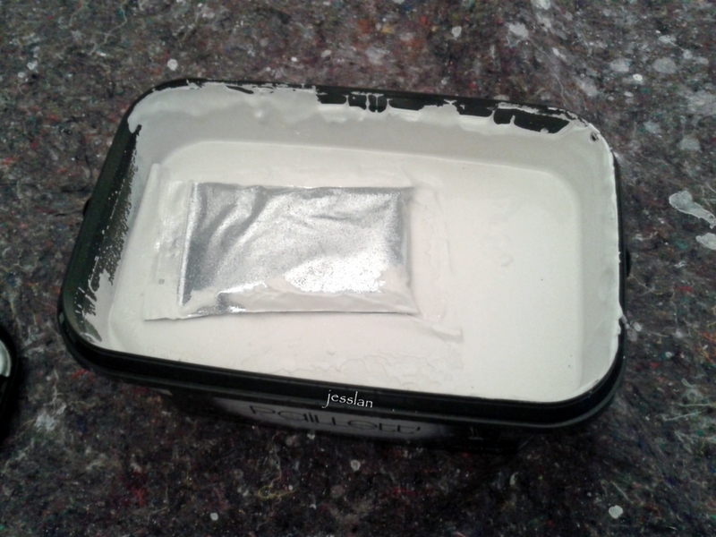 Avendo in casa della vernice traspirante bianca (che abbiamo usato per il soffitto), ne abbiamo applicate due mani, seguita da una mano di fissativo, per preparare la parete. Se avessimo utilizzato della vernice bianca lavabile sarebbe bastata sicuramente una sola passata. Una volta aperta la scatola ci si troverà un sacchettino di brillantini, appoggiati su una pellicola di plastica (1).