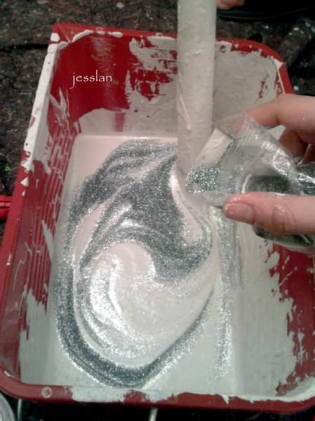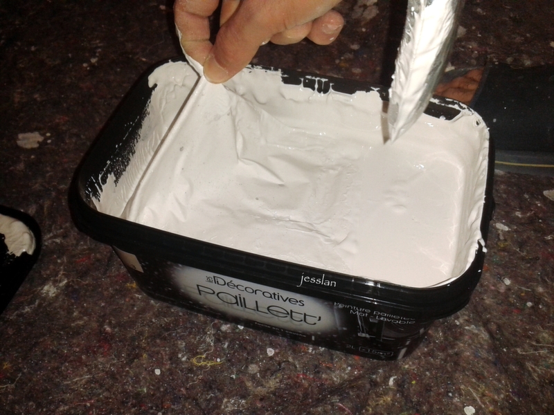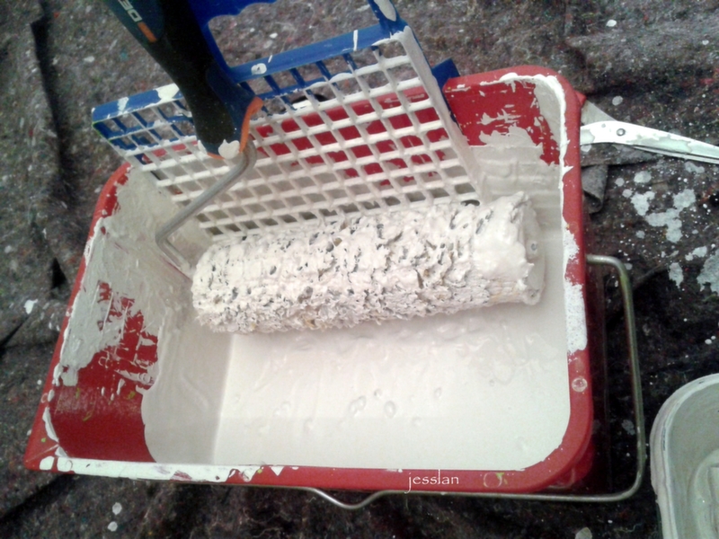 La vernice è molto molto densa (non va diluita), pertanto è necessario girarla spesso anche mentre si lavora, in modo che i glitter non si accumulino sul fondo e che il prodotto non si solidifichi. Le istruzioni dicono di applicarla a rullo con pelo corto; io consiglio di fare prima tutto il perimetro della stanza con un pennello di piccole o medie dimensioni. Prelevate poco prodotto col rullo e strizzatelo bene (8).