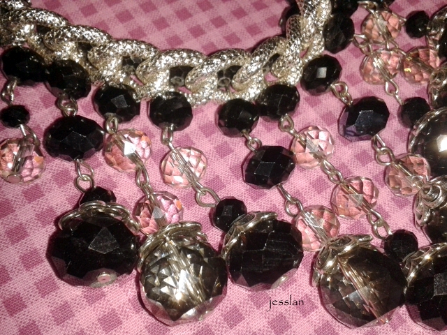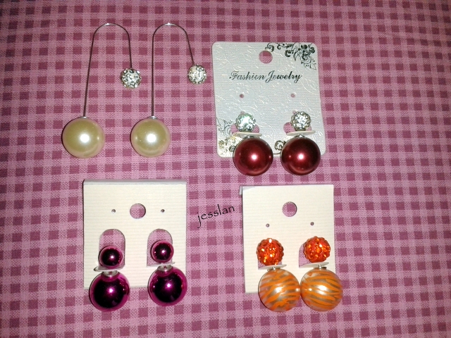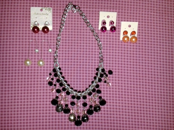 Ho comprato, inoltre, un paio di orecchini fucsia come la blusa, una collana con le pietre nere e altri orecchini con le palle…fucsia metallizzato piccolo-grande, brillantini bianchi piccolo – granata grande, brillantini arancioni piccolo – arancione a righe grande, brillantini bianchi piccolo – perla grande.
