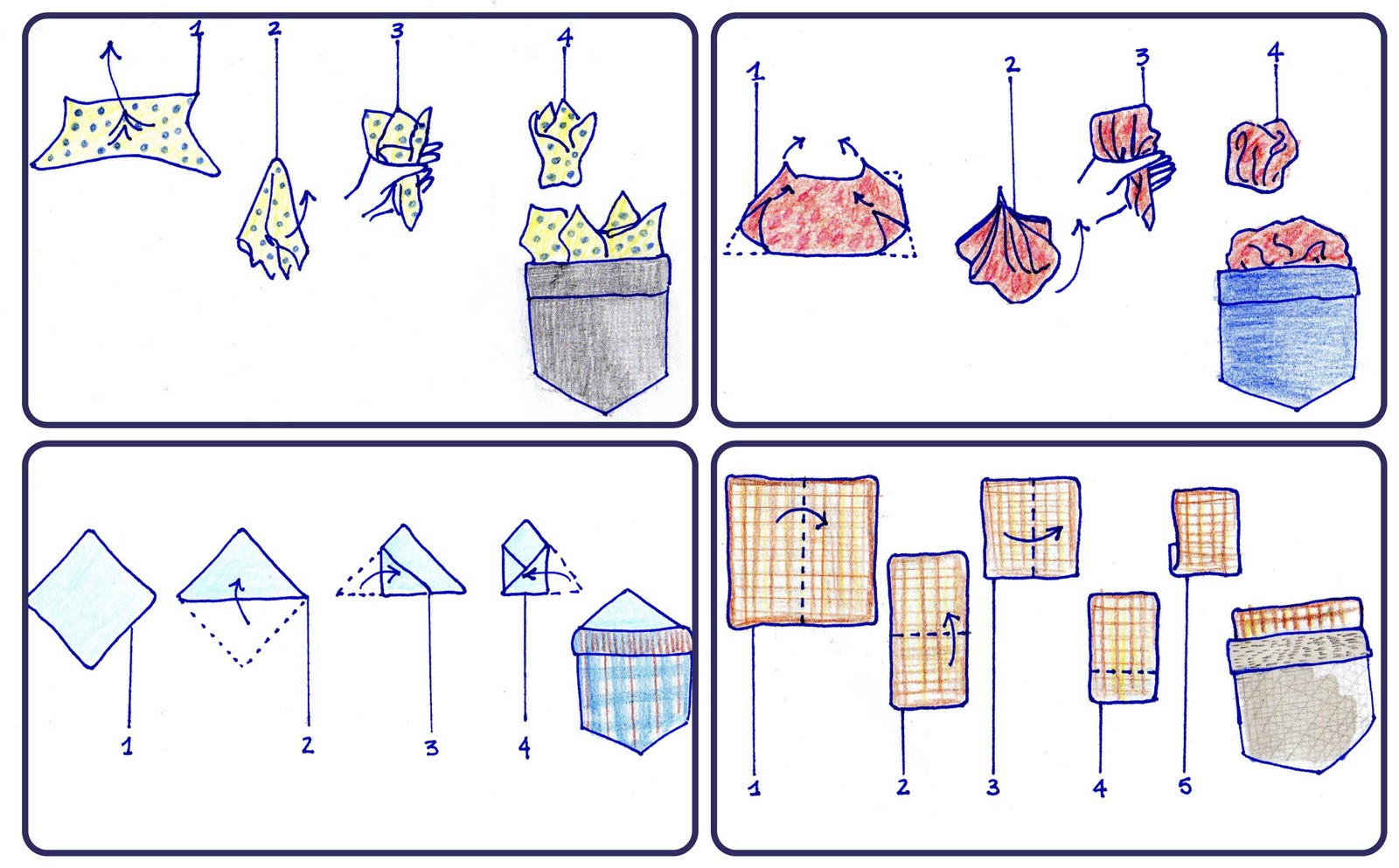 La piega più classica è quella quadrata o quella triangolare, ma ogni piega può essere utilizzata. La regola fondamentale è che la pochette deve sempre essere perfettamente stirata.