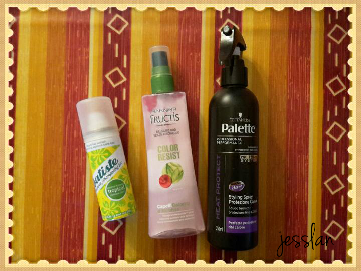 Prima di procedere alla piega a volte applico lo Styling Spray Protezione Calore di TestaNera, soprattutto quando ho intenzione di piastrarli. Utilizzo invece il balsamo Color Resist per capelli colorati di Garnier Fructis dopo uno o due giorni dal lavaggio, per dare profumo e morbidezza ai capelli; lo trovo davvero utile e il suo profumo mi piace tantissimo e per questo sono fedele da tempo a questo prodotto. Quando invece ho urgenza di ravvivare i capelli e non ho tempo di lavarli, uso lo shampoo secco, questo è il periodo dello shampoo secco Tropical di Batiste.