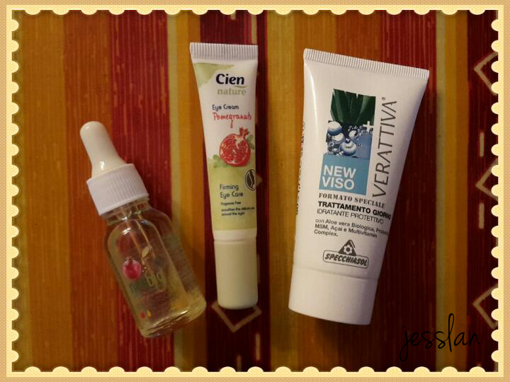 Utilizzo il contorno occhi alla melagrana di Cien Nature, sia al mattino che alla sera; costa poco e mi piace molto! Per il viso invece utilizzo la crema viso trattamento giorno idratante protettivo Verattiva Specchiasol.