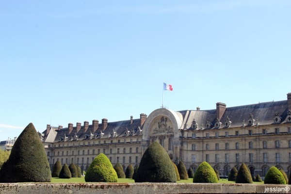 Abbiamo guardato il Trocadero soltanto dall’alto e siamo ripassati dal Champ de Mars per andare verso Les Invalides. L’Hôtel national des Invalides è un grande complesso di edifici del classicismo barocco francese costruito allo scopo di ospitare soldati invalidi. La cupola, tutta dorata, è stata costruita per la cappella privata di Luigi XIV, e ospita oggi al suo interno la tomba di Napoleone. Attualmente, la struttura ha mantenuto in parte la sua funzione, ospitando alcuni anziani reduci; un edificio è stato trasformato nel celebre Museo dell’Esercito (Musée de l’Armée) che conserva armamenti e trofei della storia francese dal Medio Evo alla seconda guerra mondiale. Purtroppo, essendo il 1 maggio, era chiuso ed era possibile soltanto visitare i giardini, ma non l’interno.