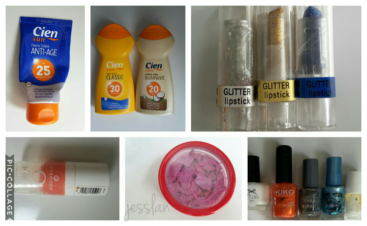 Inoltre ho eliminato due smalti Essence vecchi e ormai andati a male, uno smalto H&M mignon, uno smalto Ciatè e uno smalto arancione Kiko. Inultile dire che non ricomprerò nessuno di questi perché non esistono più. Idem dicasi per tre stick glitter (oro, argento e blu) che appartengono al paleolitico e che credevo di aver già buttato ma evidentemente no.