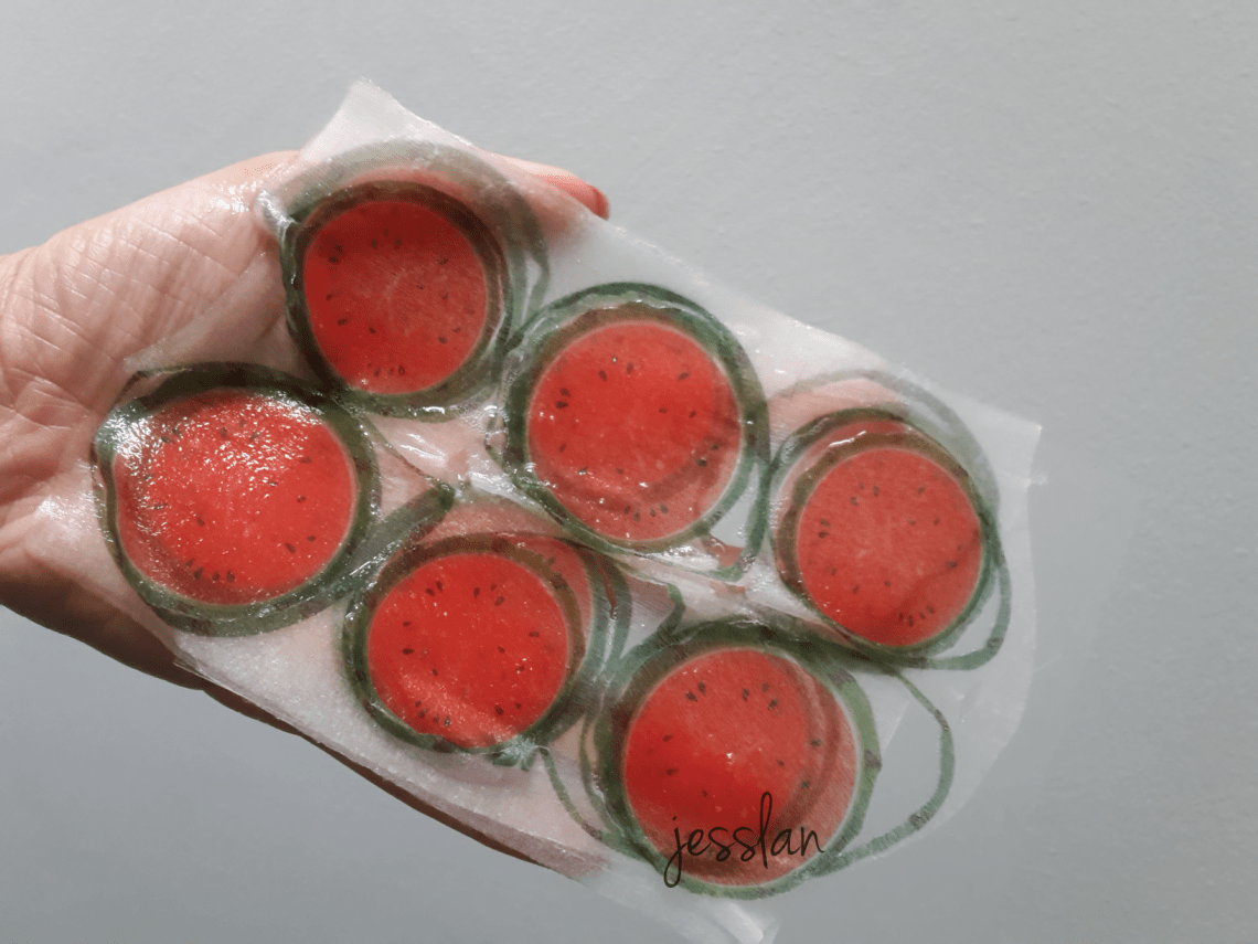 La maschera è diversa da ogni altra che abbia mai provato, è una ed è composta da sottilissimi foglietti nelle forme più disparate, nel mio caso fettine di anguria.
