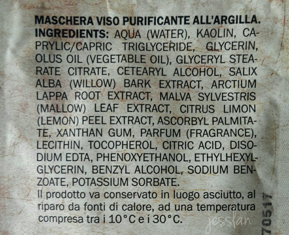 È una maschera purificante, a base di argilla bianca e contiene bardana, limone e malva. Il profumo è delicato e non fastidioso. Questo è l’inci:
