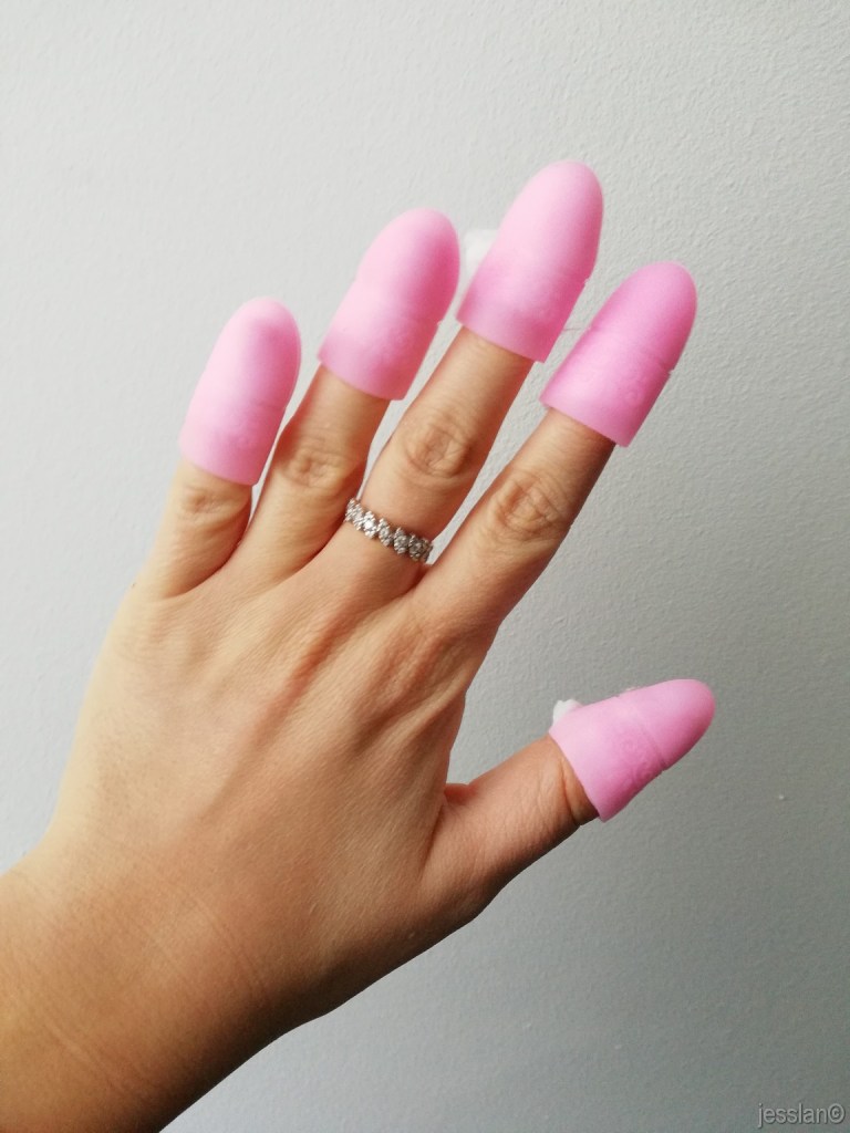 Tutto ciò che dovrete fare ora è bagnare il mezzo dischetto di cotone con l’acetone/solvente, appoggiarlo sull’unghia, assicurandosi di coprirla tutta, e mettere il cappuccio di silicone per tenerlo fermo. Una accortezza potrebbe essere quella di applicare della crema idratante sulla pelle attorno all’unghia, per evitare che il solvente dia fastidio. Personalmente non lo faccio quasi mai.