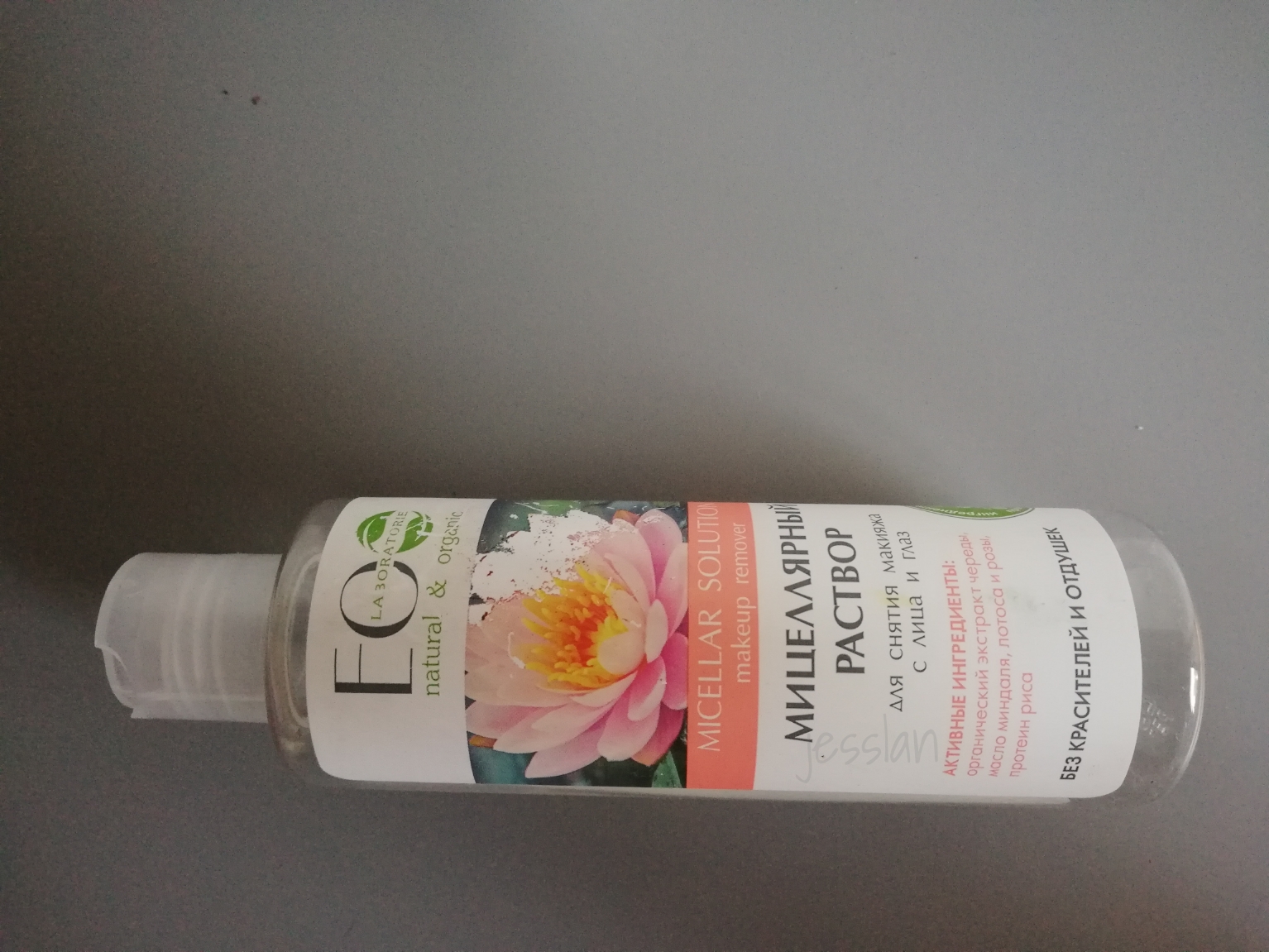 L’acqua micellare che sto utilizzando al momento per struccarmi la sera è la Micellar Solution Make-Up Remover di EO Laboratorie Natural & Organic, che ho acquistato al Cosmoprof 2018 in uno stand russo.